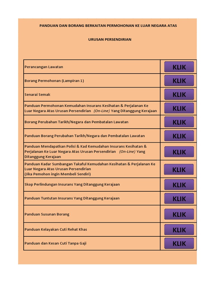 Doc 661739357 borang permohonan perjalanan ke luar negara lampiran 1 1 zakwan wan. Beliau mendedahkan terdapat aduan dibuat penjawat awam kepada cuepacs yang sekali gus menjejaskan pelaksanaan dasar dan sistem penyampaian walaupun setiap dasar dan perancangan pembangunan. Borang Permohonan Perjalanan Pegawai Awam ke Luar Negara Atas Urusan PersendirianInsurans TERKINI 2015 Nota kaki.